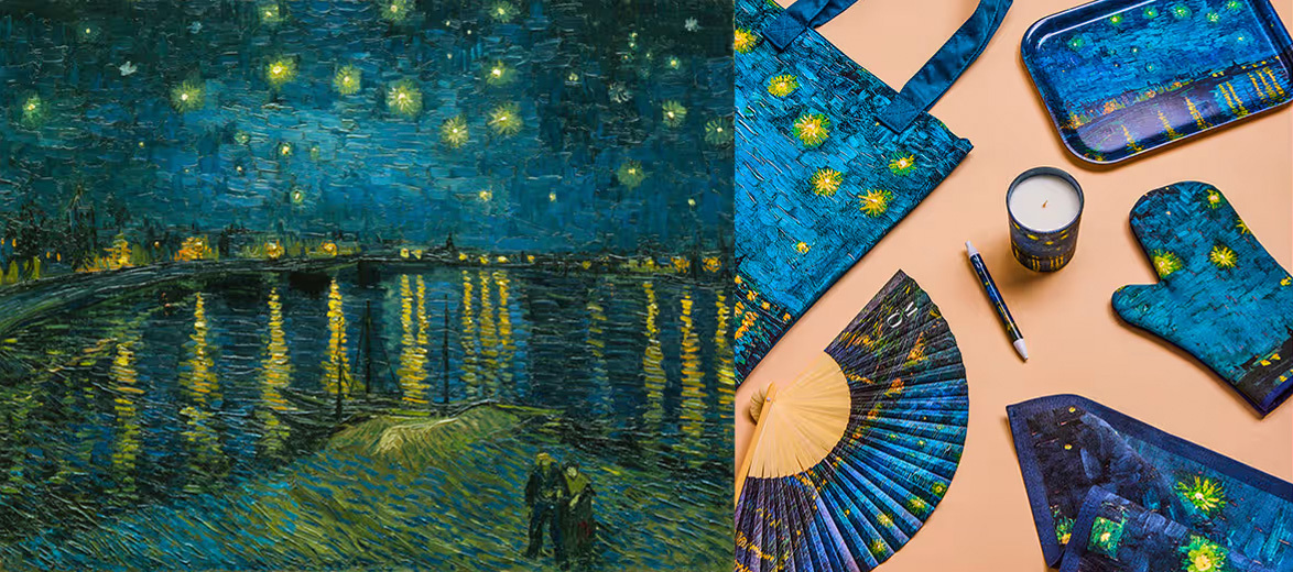 He first painted a patch of night sky in La terrasse d'un café sur la place du forum in Arles (Otterlo, Rijksmuseum Kröller-Muller). Then this view of the Rhône, in which he magnificently transcribed the colours he perceived in the darkness. Blues dominate: Prussian, ultramarine and cobalt. The city's gaslights glow an intense orange and are reflected in the water. The stars sparkle like precious stones. The presence of a couple of lovers at the bottom of the canvas reinforces the serene atmosphere of the painting in the Musée d'Orsay.