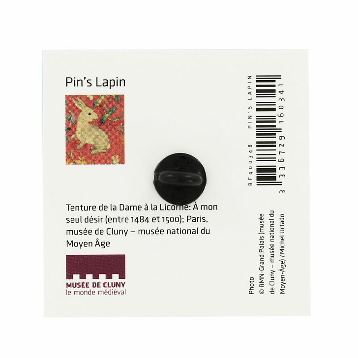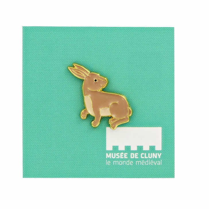This enamelled gold metal pin is inspired by one of the rabbits on the tapestry "À mon seul désir (To my only desire)", which is one of the six tapestries that make up the Lady of the Unicorn, one of the most famous works in the Cluny Museum's collections.