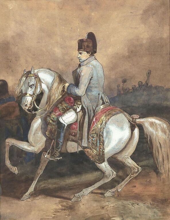 Original work by: Anonyme Original height: 48.90 cm Original width: 38.40 cm Period: 19e siècle, période contemporaine de 1789 à 1914 Technic: encre (dessin), plume (dessin), rehauts de gouache Anonyme - Portrait équestre de Napoléon - encre (dessin), plume (dessin), rehauts de gouache © RMN-Grand Palais (Château de Fontainebleau)