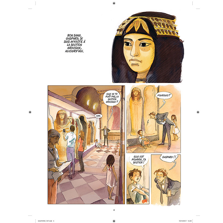 Un joli style aquarelle et de belles couleurs chaudes pour une aventure fantastique dans la section égyptienne du musée du Louvre.