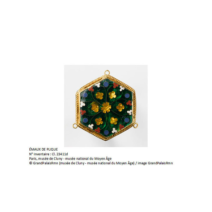 The "émails de plique" deploy an ornamental repertoire of clovers, hearts and circles, delimited by thin gold partitions and filled with opaque blue, red and white enamels, or with translucent and colorless enamel. Made according to a variant of the technique of enamel cloisonné, all finesse and delicacy, they offer games of transparency and light.