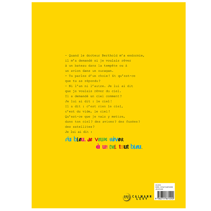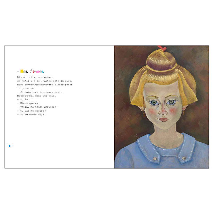 A little girl tells her father what she saw on the other side of the sky when she flew away half-daughter, half-bee: a farm like her father's childhood, with animals, a pretty redheaded Miss, Miss's anger, the blue moon...