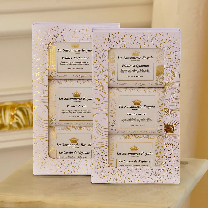 It contains 3 x 100g natural soaps (3.52oz) enriched of organic shea butter : Poudre de riz, Pétales d'églantine, Le bassin de Neptune. A Fleur-de-lys is embossed on each soap. The soaps and their packaging are entirely made in France. To obtain a luxurious high-quality product, the extra-soft soaps are crafted in Haute-Provence, in the renowned artisanal tradition of Marseille soaps. Gold hot stamping makes this set the perfect gift.