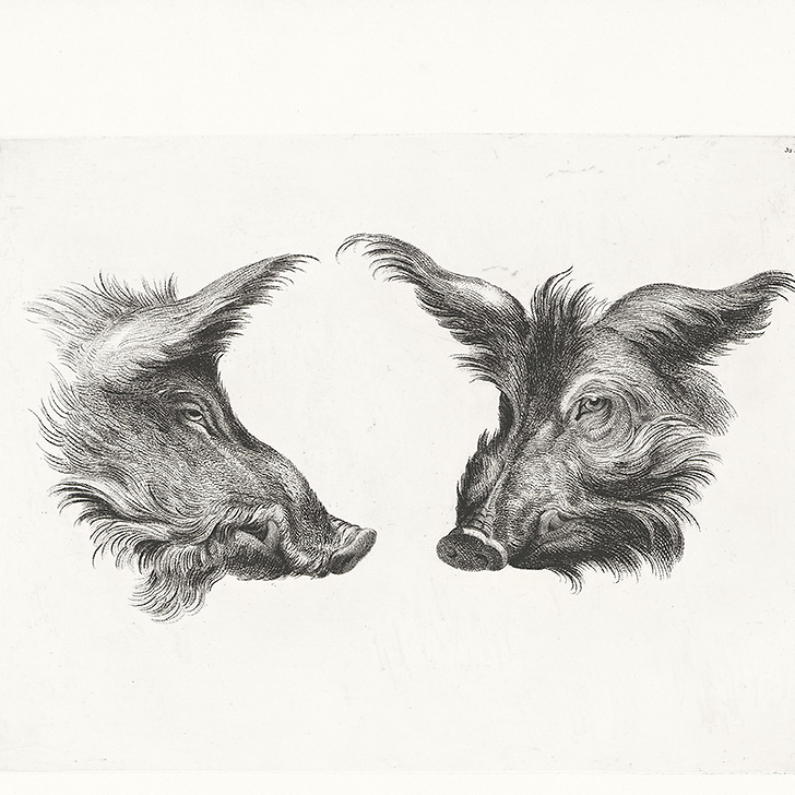Engraving Two boar's heads and two men's heads