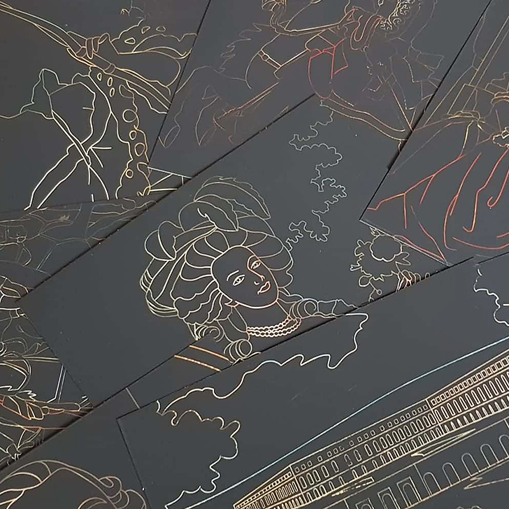 Ten scratch cards to discover the emblematic works of art of the Château de Versailles. On the back of each card, explanations and anecdotes about the work.