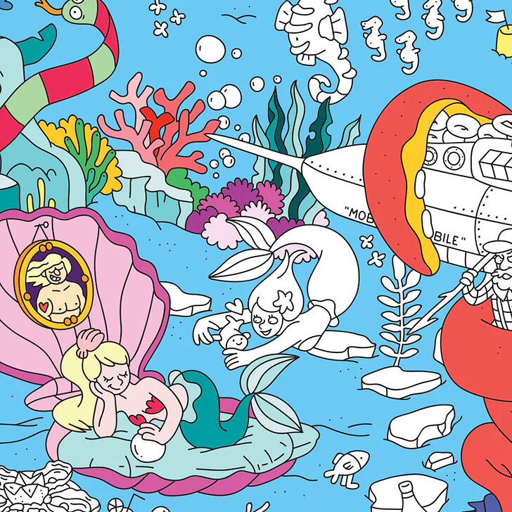 Discover and color the marine world like you've never seen it before! A line full of humor and a multitude of details, a true graphic journey to share between all generations. A limitless artistic space for coloring alone or with others, to unfold on the ground, to hang on the wall or to use as a tablecloth.