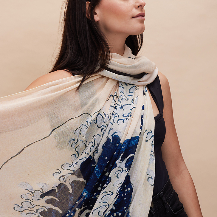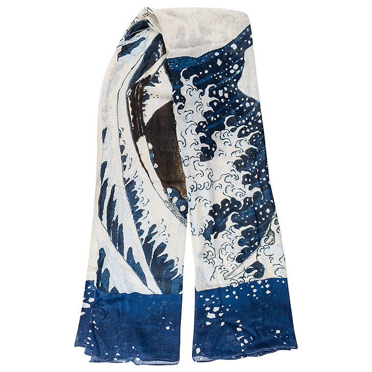 This large-format stole is inspired by a detail from one of the most famous works by Japanese artist Katsushika Hokusai (1760-1849), "Under the wave off Kanagawa" ("the great wave") (Kanagawa oki namiura) 1830-32.