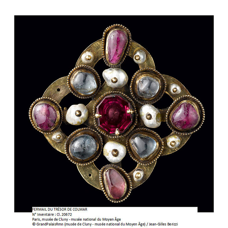 In the form of rose, or more precisely "four half compasses", he clap from the Colmar Treasury is almost entirely covered in stones which conceal the open-work setting. The settings for the precious stones are formed of two distinctive parts : a shallow, slightly pyramidal cupule, with an edge that has regular grooves, and a slender sheet surrounding the gem in a concave strip, fixed to the cupule with a rivet. These metal strips are often found on jewellery dating back to the first half of the 14th century, as well as on larger religious gold and silver pieces.