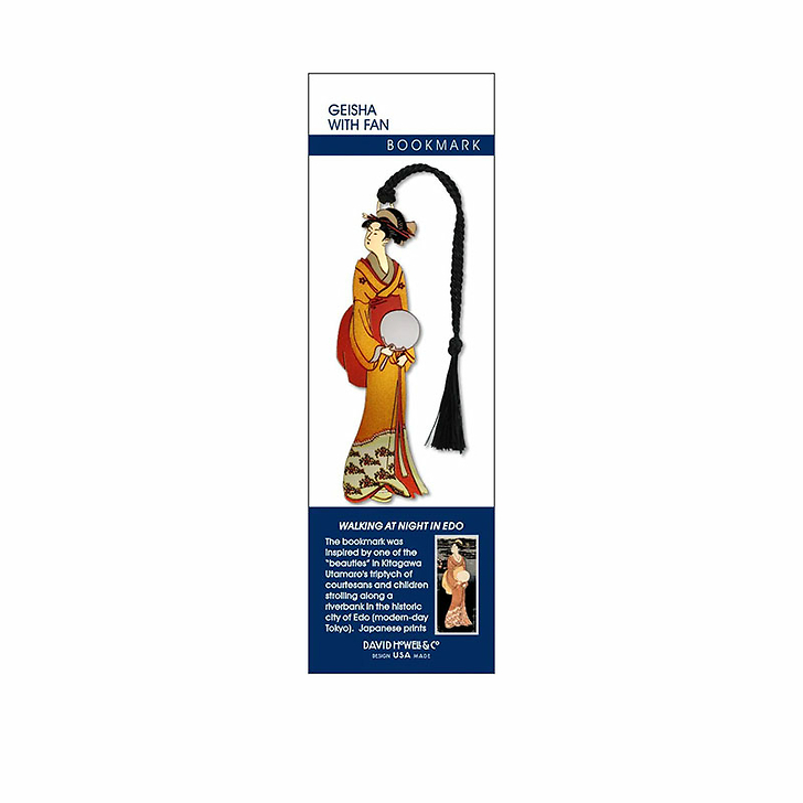 The bookmark was inspired by one of the "beauties" in Kitagawa Utamaro's triptych of courtesans and children strolling along a riverbank in the historic city of Edo (modern-day Tokyo). Japanese prints depicting actors and courtesans and the world they inhabited are referred to as ukiyo-e or the "art of the Floating World." Widely sought after by collectors since the mid-19th century, Ukiyo-e is perhaps the most popular and best-known of Japanese art forms in the Western world.