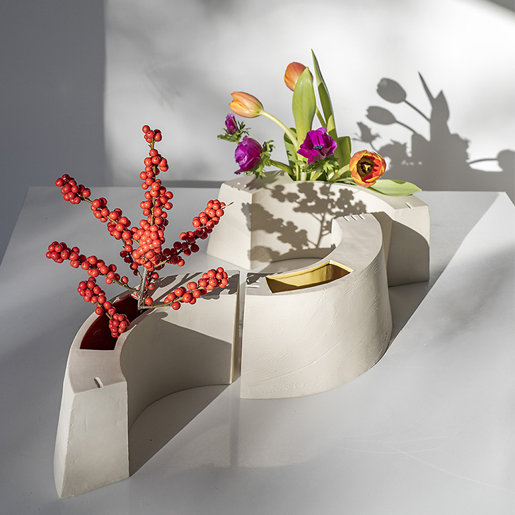 The Matrix vase, in enamelled white stoneware created especially for the musée de l'Orangerie, takes up the mould for the letter O, formed by three curved sections, each one pierced by an enamel niche in which to place flowers with short stems. The three colours of the enamel - blue, pink and yellow - stand for the primary colours which