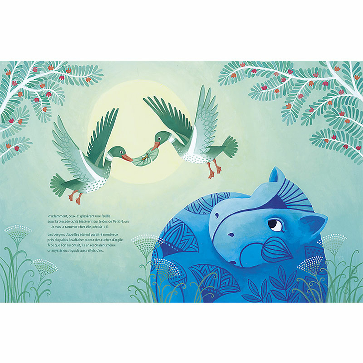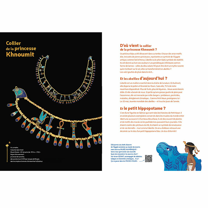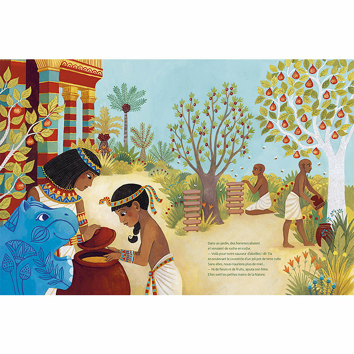 Inspired by a stele and a splendid necklace, both kept in the Louvre, the story also allows us to focus on the fate of bees. One of them, surprised by a downpour, is no longer able to fly away. Little Noun takes her home. A child, before whom everyone bows, welcomes him and shows him around the royal apiary... A lovely way of highlighting the universal link between our human concerns of yesterday and today.
