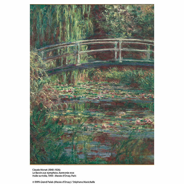In 1899 Monet painted no fewer than 12 views of his Japanese bridge in a square format. A fervent admirer of the art of the Far East, he was doubtless inspired by the collection of Japanese prints that he kept on his walls in his home at Giverny. Each version of the Water Lilies is dominated by a specific harmony of colour, now green, now pink.