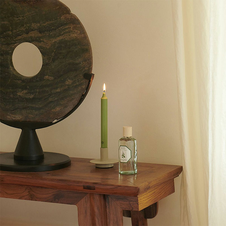 Their botanical perfume prevails when opening the box; once lit up, the taper candles only diffuse a golden halo.