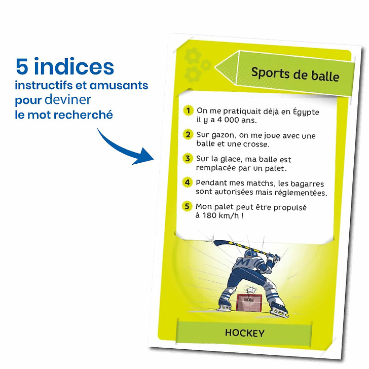 All the players play together. Call out the clues on your card one by one. As soon as a player thinks they have the right answer they give it out loud. Attention! You will also have to show your skill by tossing the dice on the board to collect more cards (or not).