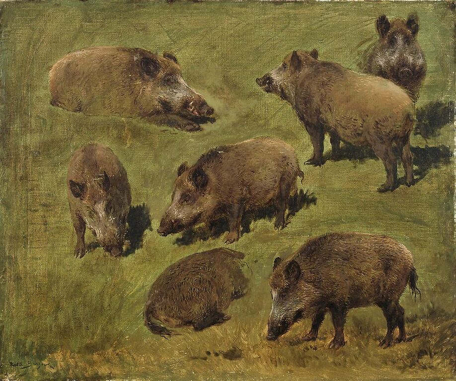 Original work by: Rosa Bonheur (dit), Bonheur Marie Rosalie Original height: 46.00 cm Original width: 55.00 cm Technic: huile sur toile Rosa Bonheur (dit), Bonheur Marie Rosalie - Sangliers couchés et debout, 7 esquisses - huile sur toile © RMN-Grand Palais (Château de Fontainebleau)