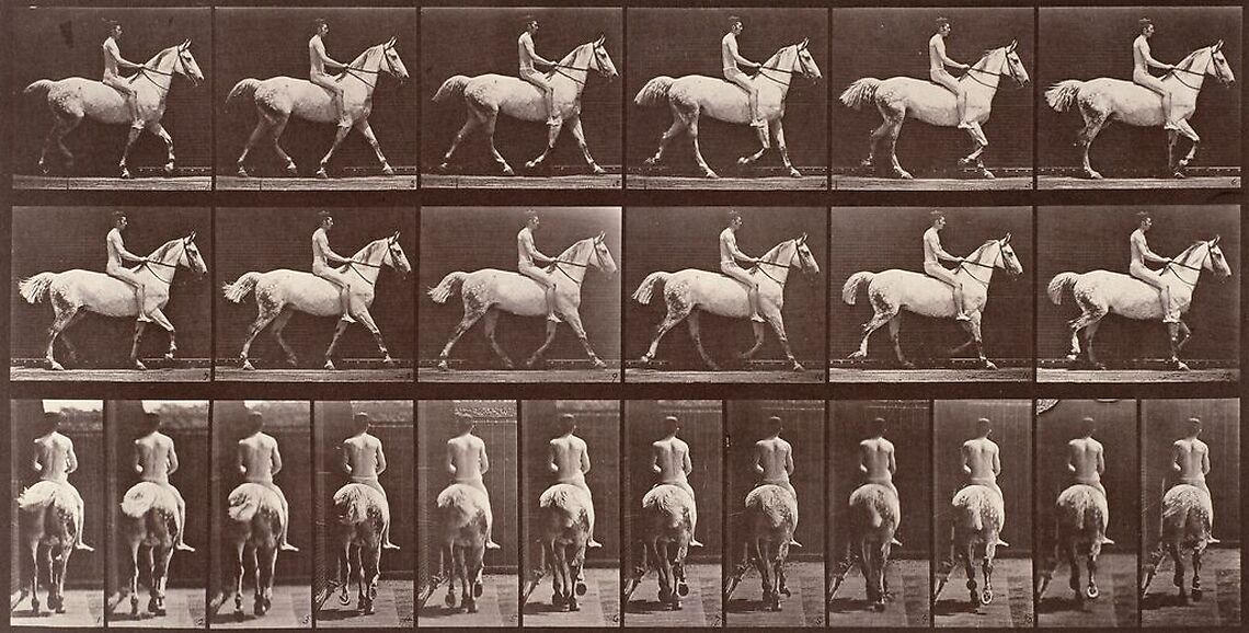 Original work by: Muybridge Eadweard Original height: 19.50 cm Original width: 37.50 cm Period: 19e siècle Technic: chronophotographie, héliogravure Muybridge Eadweard - Cheval blanc au pas - chronophotographie, héliogravure © RMN-Grand Palais (musée d'Orsay)