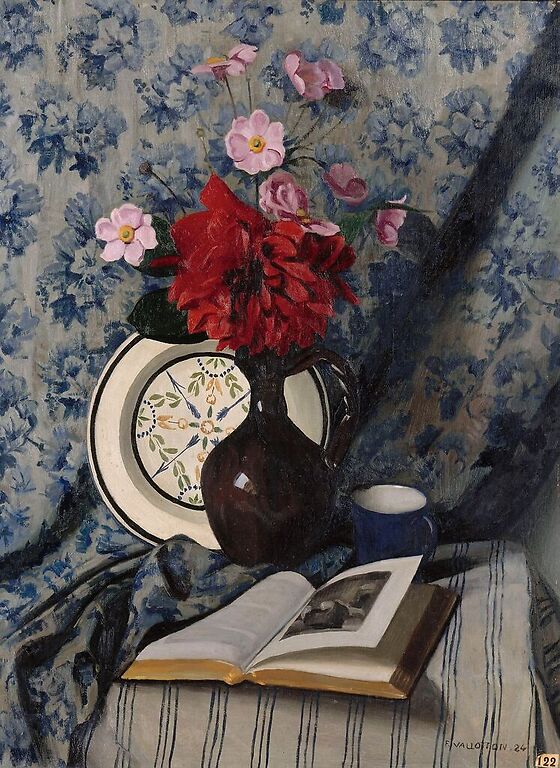 Red Dahlias and open book (art prints)