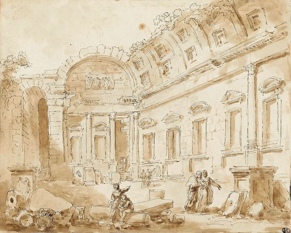 Hubert Robert is one of the emblematic figures of the general renewal of landscape painting in France during the second half of the 18th century. Spotted from an early age for his talents as a draughtsman, Hubert Robert perfected his art in Italy, at the Académie de France in Rome. He works with the painter Giovanni Paolo Panini, but also with Giovanni Battista Piranesi (commonly known as Piranesi). This artistic education was also an opportunity for the painter to make friends with Jean-Honoré Fragonard. Both share a common passion for picturesque subjects, where reality and imagination mix; a singularity that he will keep throughout his career.