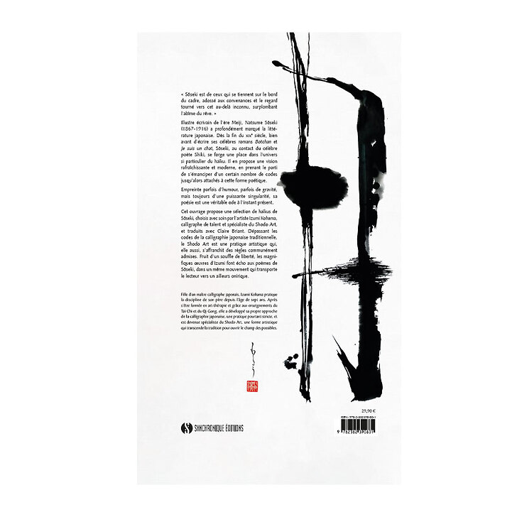 This book offers a selection of Sôseki's haikus, carefully chosen by the artist Izumi Kohama, a talented calligrapher and specialist in Shodo Art, and translated with Claire Briant. Going beyond the codes of traditional Japanese calligraphy, Shodo Art is an artistic practice that also breaks free from commonly accepted rules. The fruit of a breath of freedom, Izumi's magnificent works echo Sôseki's poems, in a single movement that transports the reader to a dreamlike elsewhere.