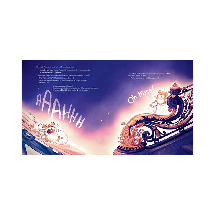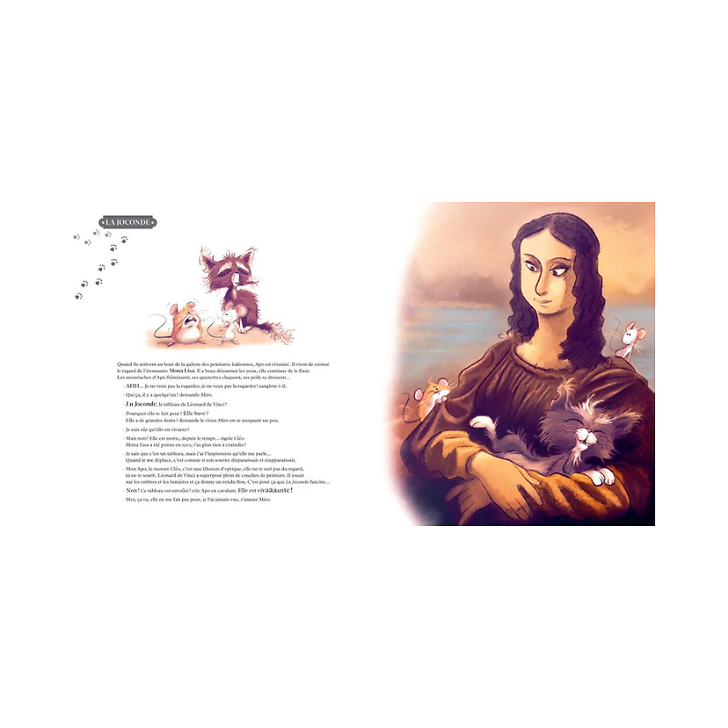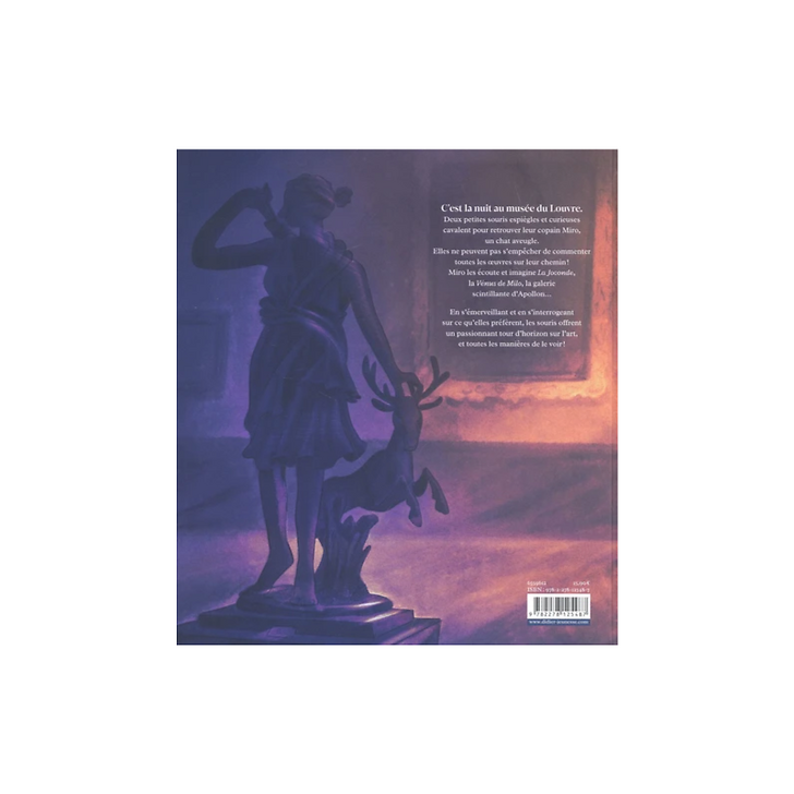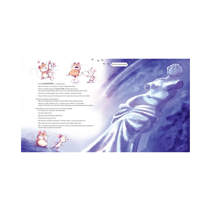 It's almost 9 p.m. in the grand gallery of the Louvre Museum. The visitors have left, but you can hear someone scurrying across the parquet floor. It's Cleo and Apo, two mice who are running to meet Remi, the museum's night watchman. Miro, the old blind cat, joins them, and the mice describe the artworks they see, which move them and sometimes scare them! Cleo, the scholar, knows almost all the secrets of the paintings and statues, while Apo, a merry fellow, is fascinated by the monumental works and the glittering galleries. They don't always agree on the beauty of the artworks, and have enthusiastic and humorous debates about the allure of the Mona Lisa, the portrait of Louis XIV, the splendor of the galleries, and the Venus de Milo. Even little mice can question what makes art and beauty!
