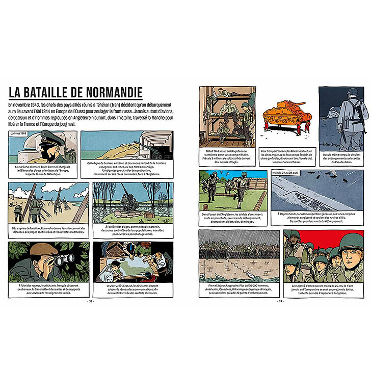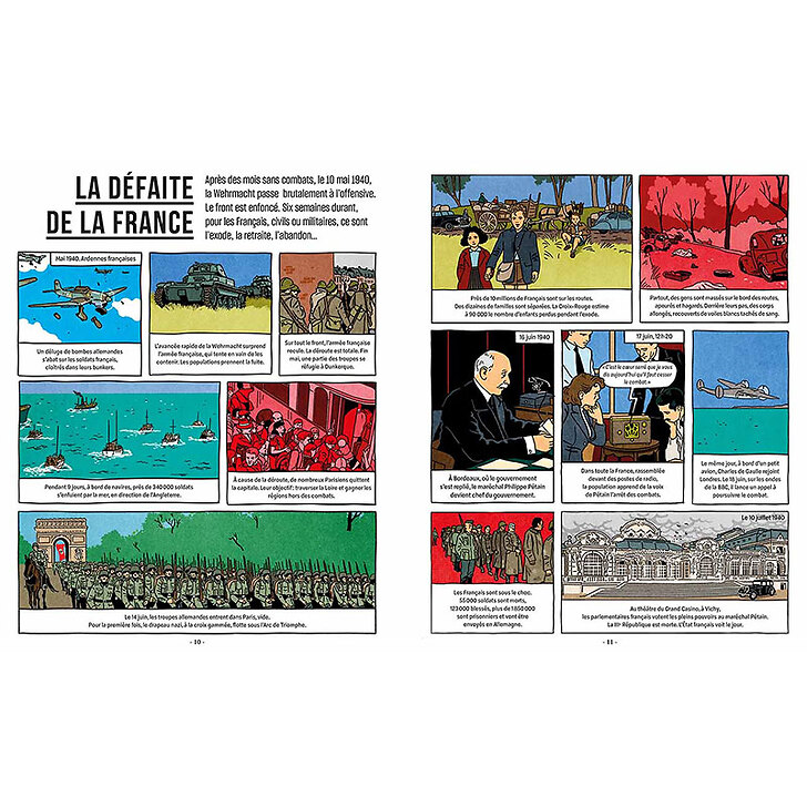Ten chronologies covering the course of World War II, the Liberation of France in 1944 and its reconstruction, accompanied by thirteen comic book stories to understand each period.