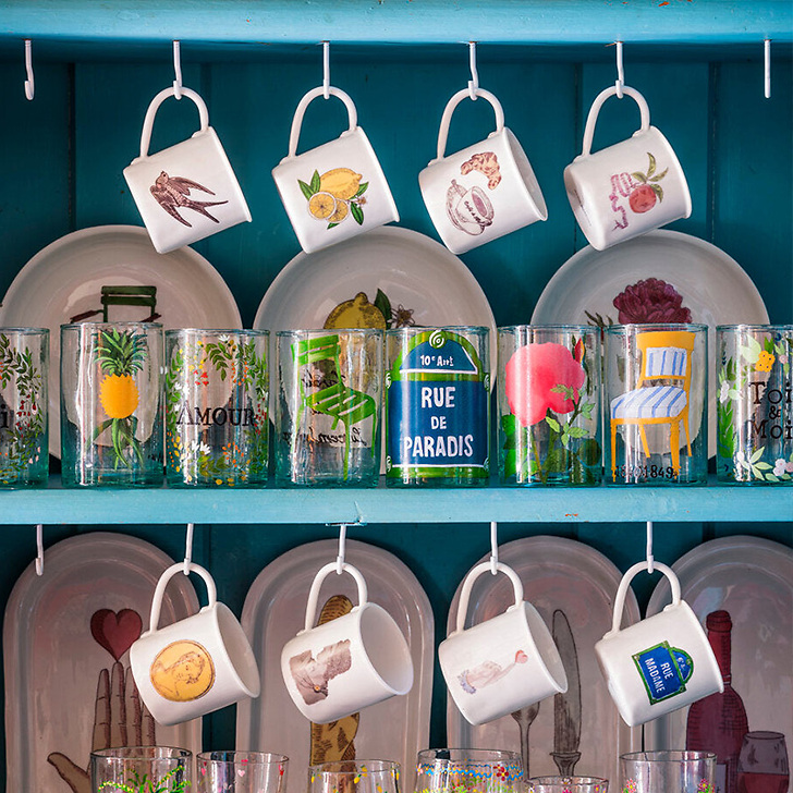 The illustrations are applied in Marin Montagut's workshops in Paris, and each piece is fired on site.