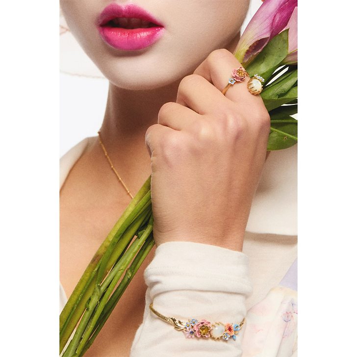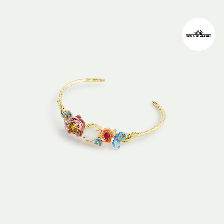 Gold-plated brass bangle bracelet. Hand-enamelled rose, aster and forget-me-not flowers in shades of pink, purple and blue adorned with a faceted crystal, round mother of pearl stone, enamelled sky-blue ribbon and golden acanthus leaves. Les Néréides has worked with the Palace of Versailles to design jewellery inspired by the symbolism of Louis XIV, architectural elements and the lush gardens of the palace.