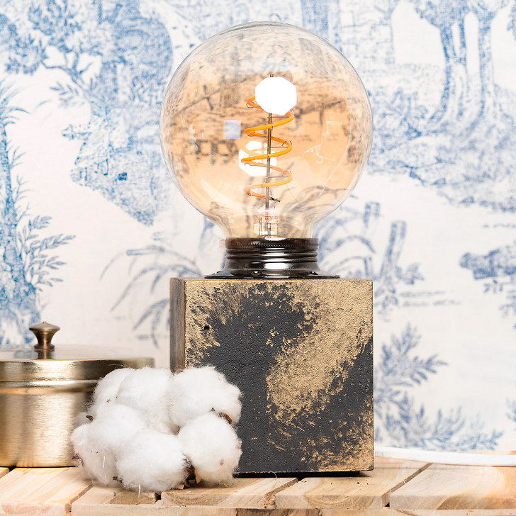 This lamp has a coloured concrete base with a patina, in the shape of a cube, and a LED filament bulb.