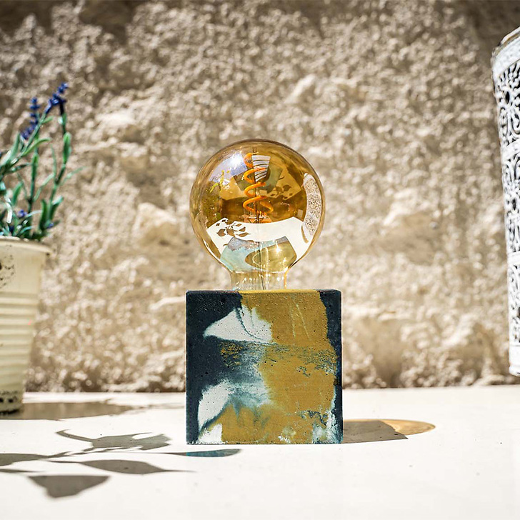 This lamp is made up of a cube-shaped support in tie&dye coloured concrete and a small globe bulb with LED filaments. The tie&dye concrete is obtained by mixing three types of concrete at random, one beige and two coloured. So each lamp has its own unique effect.