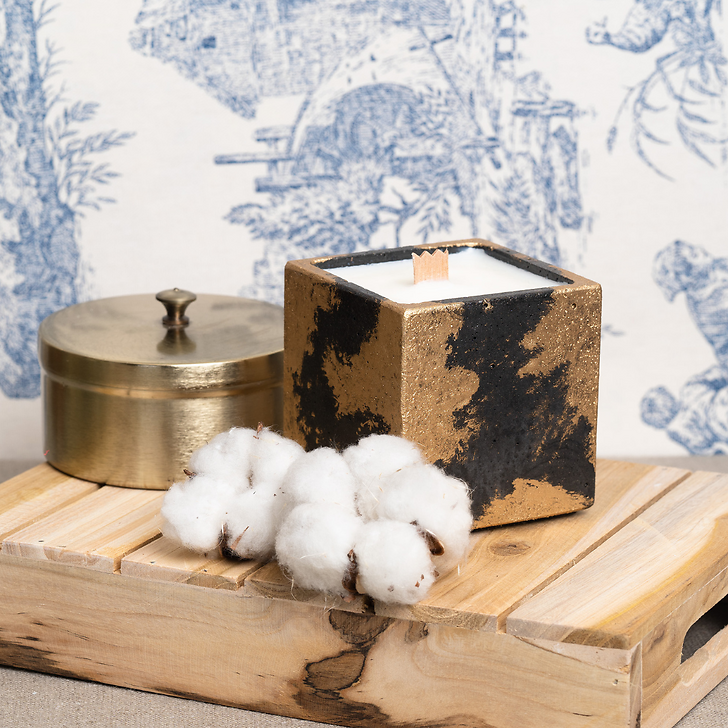 A candle made in France from 100% natural soy wax and hand-poured. The wooden wick of this candle is also 100% natural to ensure better combustion of the wax. The beautiful patina edging around the candle is achieved by applying a golden patina that gives the concrete a beautiful shine.