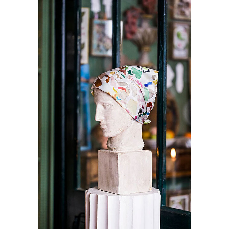 Exclusive illustration for silk squares, "PALETTE" intoxicates us with its colors dancing joyfully together. Inspired by the watercolor palette that Marin Montagut uses to enchant us with his illustrations, this colorful silk square is delicately crafted by a family manufacturer in Lyon, France.