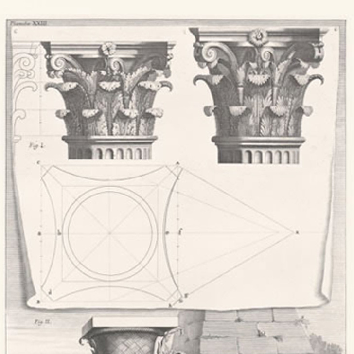 This print is from one of the 64 plates illustrating Vitruvius' Ten Books of Architecture, translated by Claude Perrault in 1673. The work, one of the few surviving treatises on ancient architecture, was commissioned by Colbert for the Académie des Sciences, which he had founded seven years earlier, in 1666. To illustrate his commentaries and translations, the great engravers of the 17th century were called upon. These included Gérard Edelinck and Sébastien Leclerc. Plate 23, engraved with a burin, illustrates part of chapter I of Book IV, dealing with the three orders, their origin and invention.