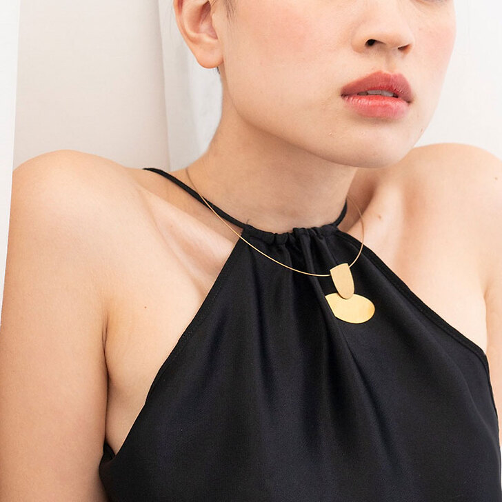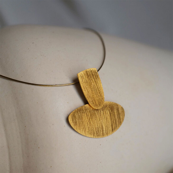 Necklace in 24 K gold-plated matte metal with a pendant in irregular shapes that pay homage to the volumetric female bodies of the iconic marble goddess figures of the Cyclades Islands. Design based on the drawings of Barcelona illustrator and graphic artist Judit Canela.