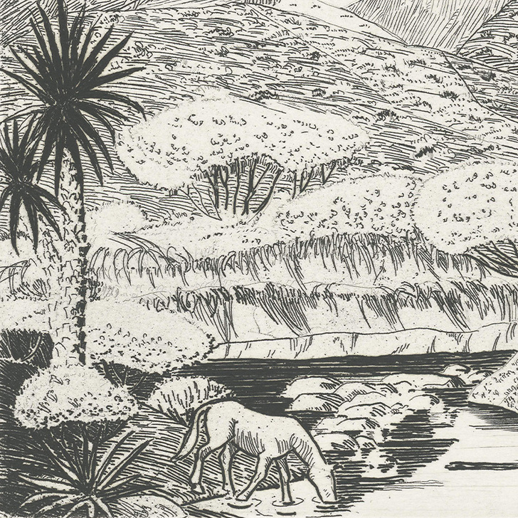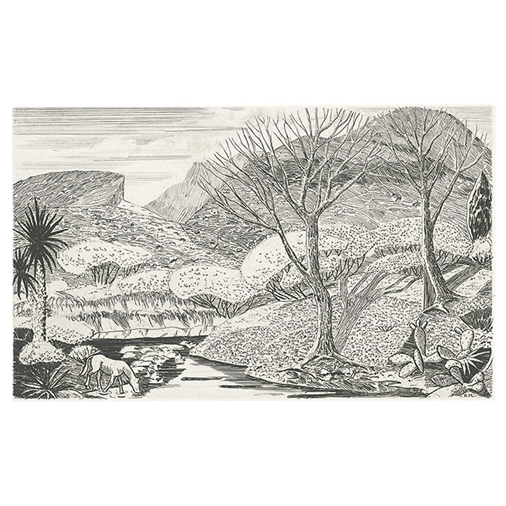 In the 1940s, after spending ten years in Europe, Roderick Mead returned to the United States and settled in Carlsbad, New Mexico, his wife's home state. Through this print entitled Rocky Arroyo Landscape in New Mexico or Landscape with a Horse Drinking at the River, he shows us the arid natural landscapes in which he lived at that time. Amidst cacti and hills, a horse drinks from the stream that gives the engraving its name, the Rocky Arroyo. This work thus testifies to Mead's admiration for the nature of New Mexico, an inexhaustible source of inspiration in his work, and the special bond he has with this southern state of the United States.