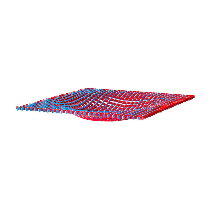 In coloured stainless steel, the Gravity Centrepiece, is a sculptural object representing a Cartesian grid inspired by the force of gravity exerted by celestial bodies. Thanks to the ingenious assembly of the blue and red axes, the shape evolves from diamond to square.