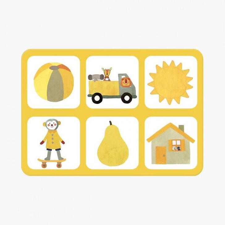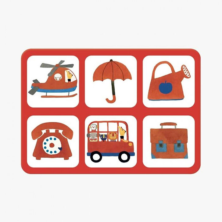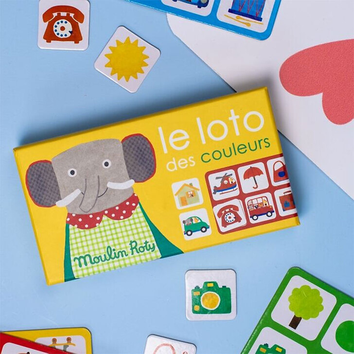 Cardboard arousing game grouping four primary color plates, with illustrations of everyday objects, treated as an imager, taking the graphic association of the range. "A lotto to observe, learn and name colours and objects".