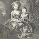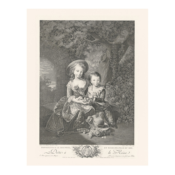 A renowned portrait painter of the 18th and 19th centuries, Elisabeth Louise Vigée Le Brun enjoyed such a flourishing career that she became the official painter of Queen Marie Antoinette. The 1784 painting was commissioned directly by the Queen and reflects the characteristics of portraits of aristocratic children, such as that of the Count of Artois and his sister Madame Clotilde painted by François-Hubert Drouais in 1763. The children are outdoors, surrounded by nature and accompanied by animals, in this case baby birds in the young boy's hand. This engraving by Maurice Blot (1753/54-1818) depicts the children of the royal couple, Louis the Dauphin and his sister Marie-Thérèse. Blot's reproduction of the original work preserves the great innocence of these two royal descendants and the tenderness of Marie-Thérèse's gaze on her brother, the Dauphin.
