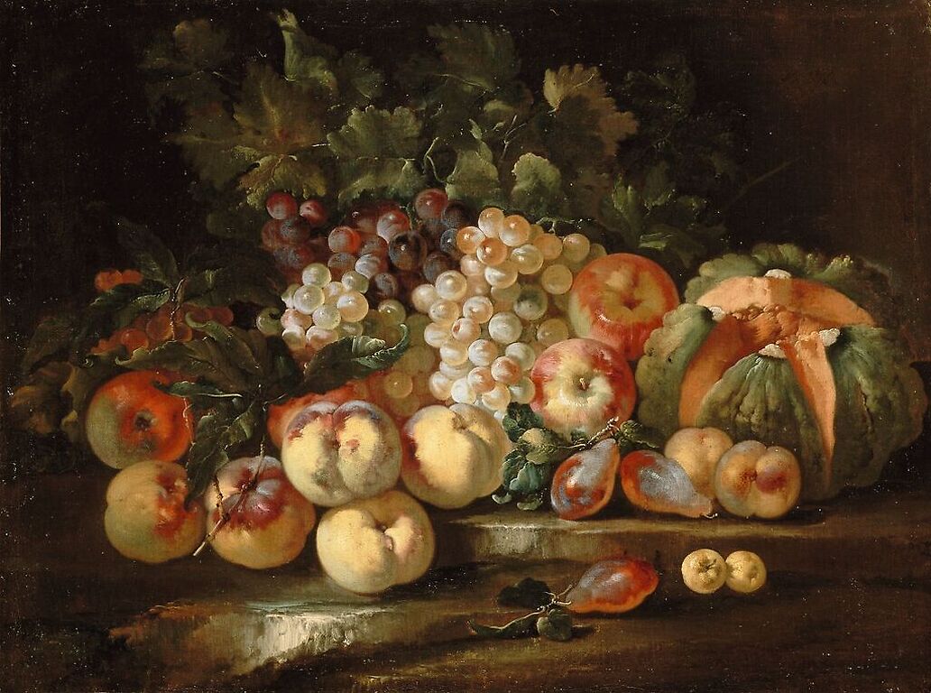Original work by: Ruoppolo, Giuseppe (attribué à) Original height: 49.00 cm Original width: 64.00 cm Period: 18e siècle, 17e siècle, période moderne (Europe occidentale) Technic: huile sur toile Ruoppolo, Giuseppe (attribué à) - Nature morte aux raisins et aux pommes - huile sur toile © RMN-Grand Palais (musée du Louvre)