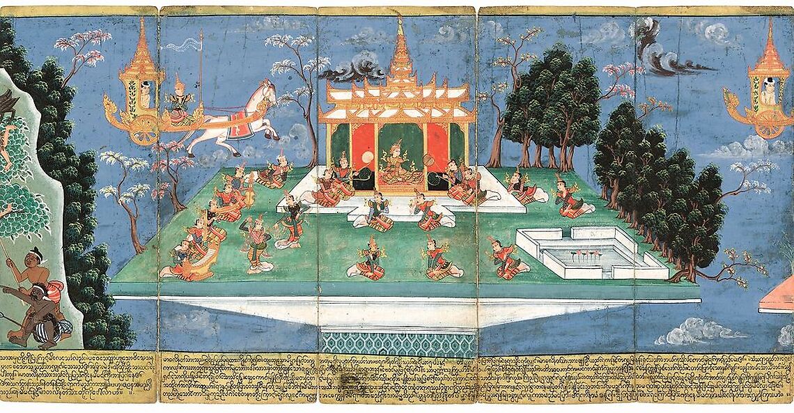 Original work by: Saya Ko Kya Nyun SAYA KO KYA NYUN Nemi Jataka (détail), 1869, manuscrit de type parabaik, art Mandalay, Birmanie (Myanmar) Encre et couleurs sur papier. H. 53,5 ; L. totale 950 cm © Photo Rmn - Grand Palais (MNAAG, Paris) - T. Ollivier © Rmn - Grand Palais, Paris 2019