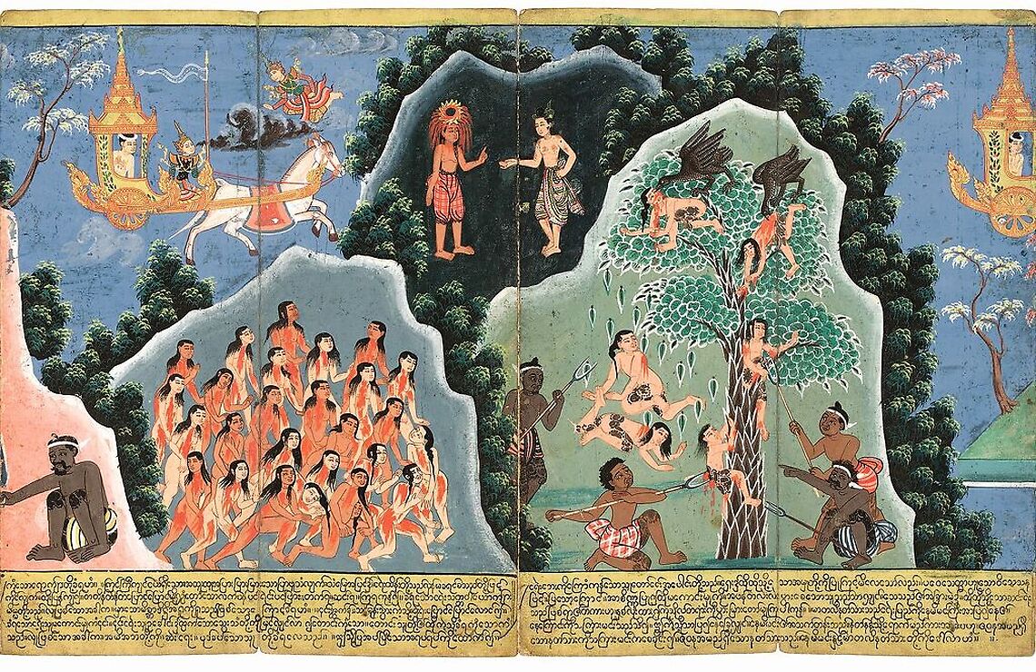 Original work by: Saya Ko Kya Nyun SAYA KO KYA NYUN Nemi Jataka (détail), 1869, manuscrit de type parabaik, art Mandalay, Birmanie (Myanmar) Encre et couleurs sur papier. H. 53,5 ; L. totale 950 cm © Photo Rmn - Grand Palais (MNAAG, Paris) - T. Ollivier © Rmn - Grand Palais, Paris 2019