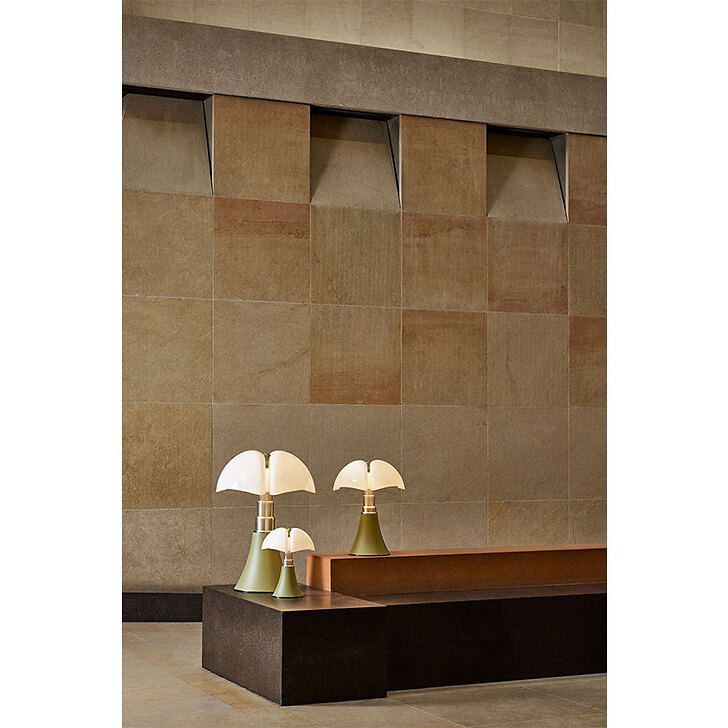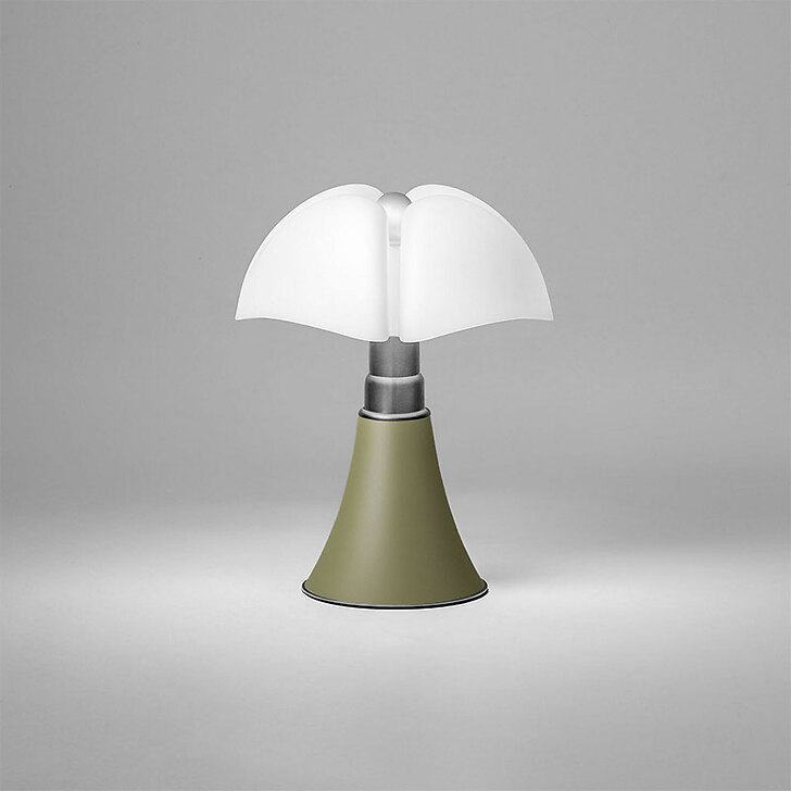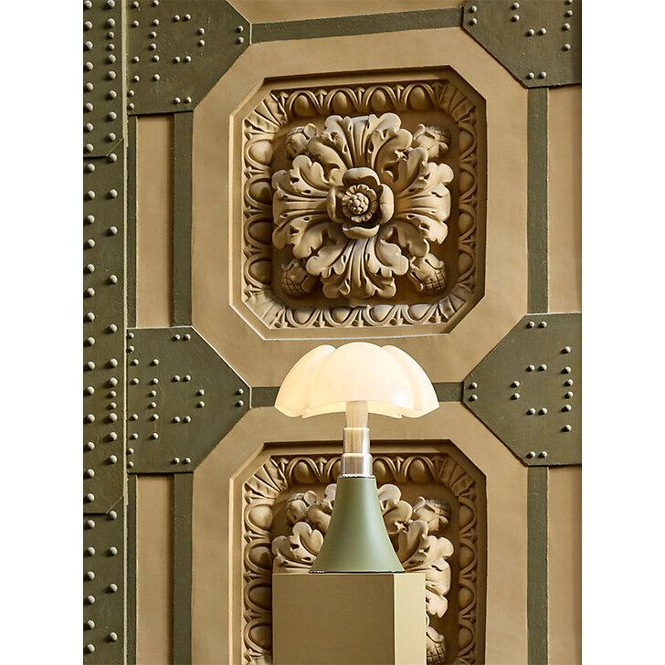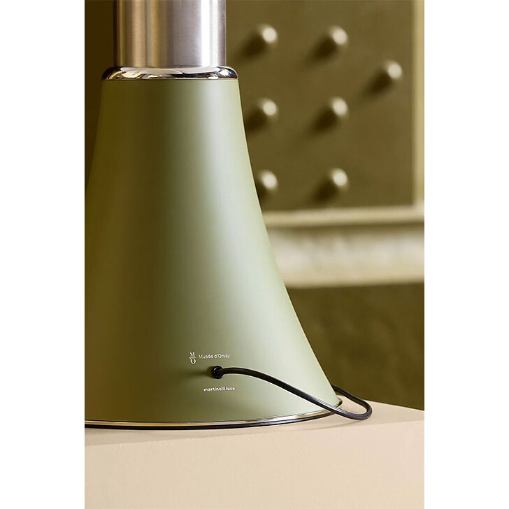 To celebrate the 40th anniversary of the Musée d'Orsay, the Pipistrello lamp is presented in a refined special edition. The aluminum cone and knob are finished in a distinctive green shade inspired by the architectural details of the museum's interior. It features an opal white methacrylate diffuser, a satin-finished stainless steel telescopic stem, and a chrome-plated metal ring and base. The lamp is fitted with an LED light source and plug-in power supply.