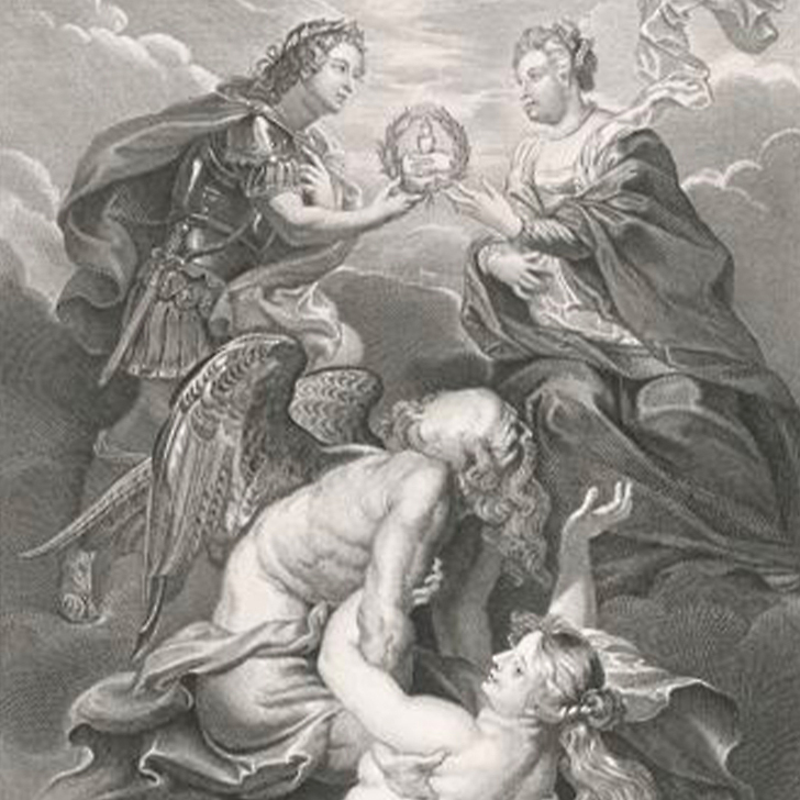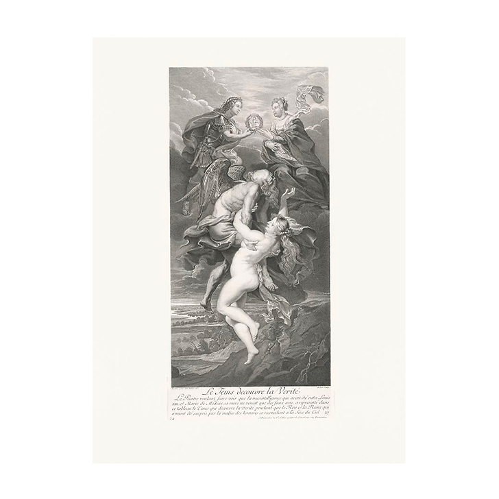 The Triumph of Truth celebrates the understanding and reconciliation between the Queen and her son, as evidenced by the painting's second title, The Perfect and Sincere Union of the Queen Mother and Her Son, as well as the text inscribed at the bottom of the print: "The painter, wishing to show that the misunderstanding that had existed between Louis XII and his mother, Marie de' Medici, stemmed solely from false counsel, has depicted in this painting Time revealing the Truth, while the King and the Queen, who had been deceived by the malice of men, are reconciled before Heaven.