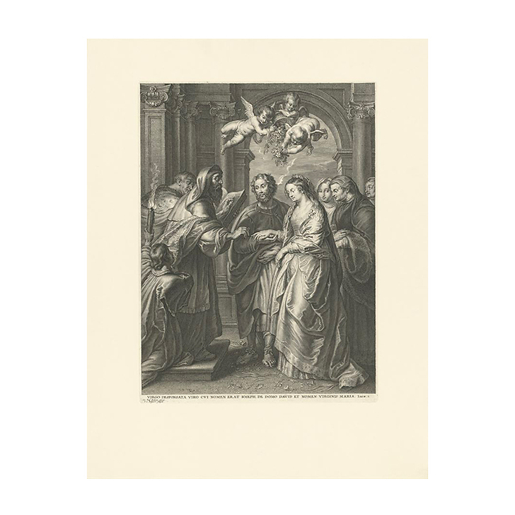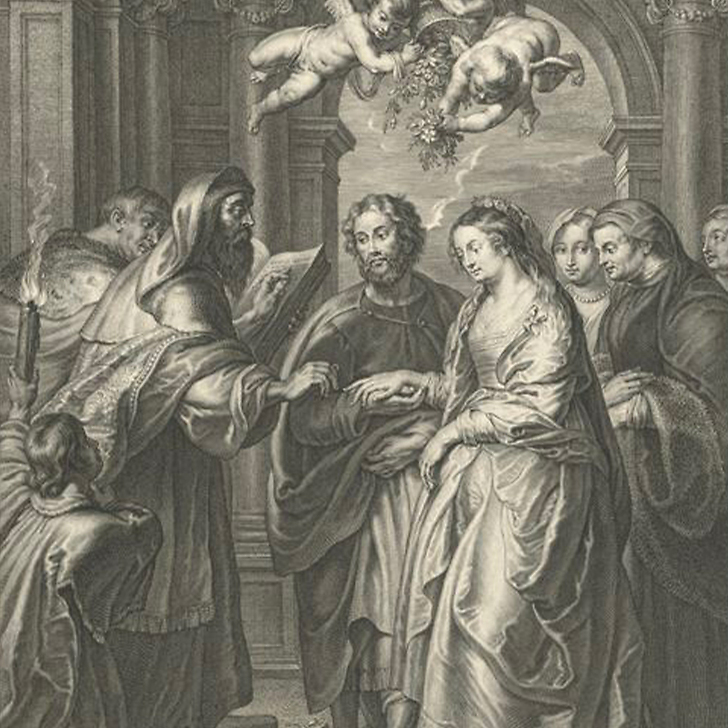 A classic theme in Christian iconography, the marriage of Mary and Joseph is a significant episode in the Virgin's life. The ring, a symbol of this union, is at the center of the composition and is about to be slipped onto the bride-to-be's finger. Three putti hover above the scene, pouring a basket of flowers onto the couple, some of which already litter the ground in front of the figures. The Virgin, dressed in a sumptuous gown and a wreath of flowers holding her veil, is strikingly illuminated. Her loose hair, the delicacy of her hands, and the beauty of her attire exude great grace.