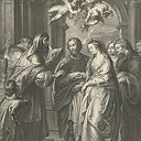 A classic theme in Christian iconography, the marriage of Mary and Joseph is a significant episode in the Virgin's life. The ring, a symbol of this union, is at the center of the composition and is about to be slipped onto the bride-to-be's finger. Three putti hover above the scene, pouring a basket...