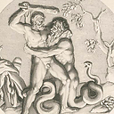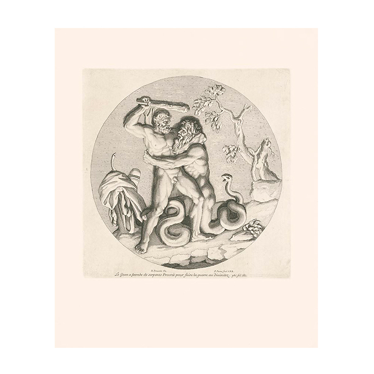 The Battle of Hercules and Procrées is part of a set of 19 plates engraved by Jean Pesne in 1678, based on the series of the Twelve Labors of Hercules-trompe-l'œil medallions painted by Nicolas Poussin for the Grand Gallery of the Louvre. Hercules is depicted as a virile hero. He dominates the scene and is about to strike his attacker, the giant Procrées with serpent legs, with a club. However, one of the snakes is biting Hercules' calf, and a second one to the right of the composition appears ready to attack. Thus, Nicolas Poussin chose to depict a moment of tension and intense struggle, even as the outcome of the battle remains uncertain.