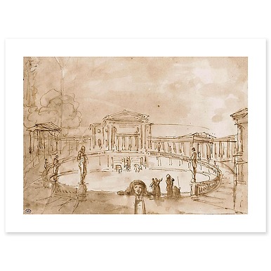 Large central pool surrounded by a balustrade, in the centre of a square (art prints)