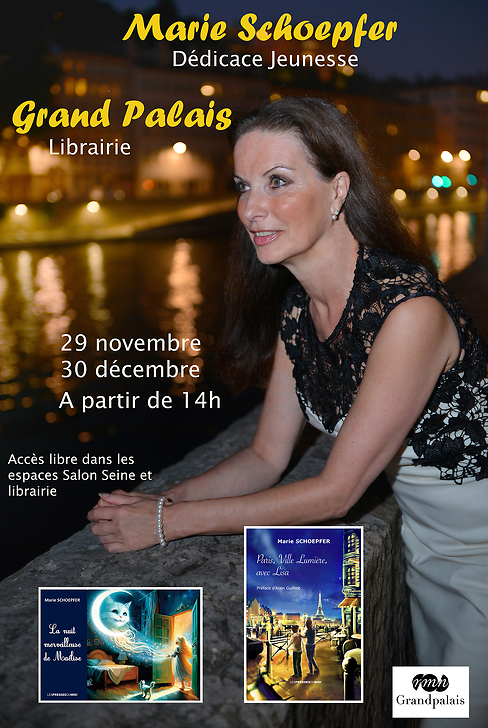 L'autrice Marie Schoepfer sera présente au Salon Seine au Grand Palais pour une séance de dédicace autour de deux de ses ouvrages : La Nuit merveilleuse de Maélise et Paris, Ville lumière, avec Lisa qui mêlent découverte de soi et culture.
