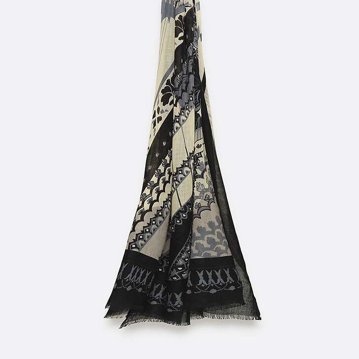 Le coloris Noir souligne la force graphique du motif, comme les lignes d'acier de la Nef qui structurent l'espace avec élégance et modernité. Format généreux permettant de multiples portés, du drapé ample à l'écharpe structurée. Une pièce enveloppante, fluide et lumineuse.