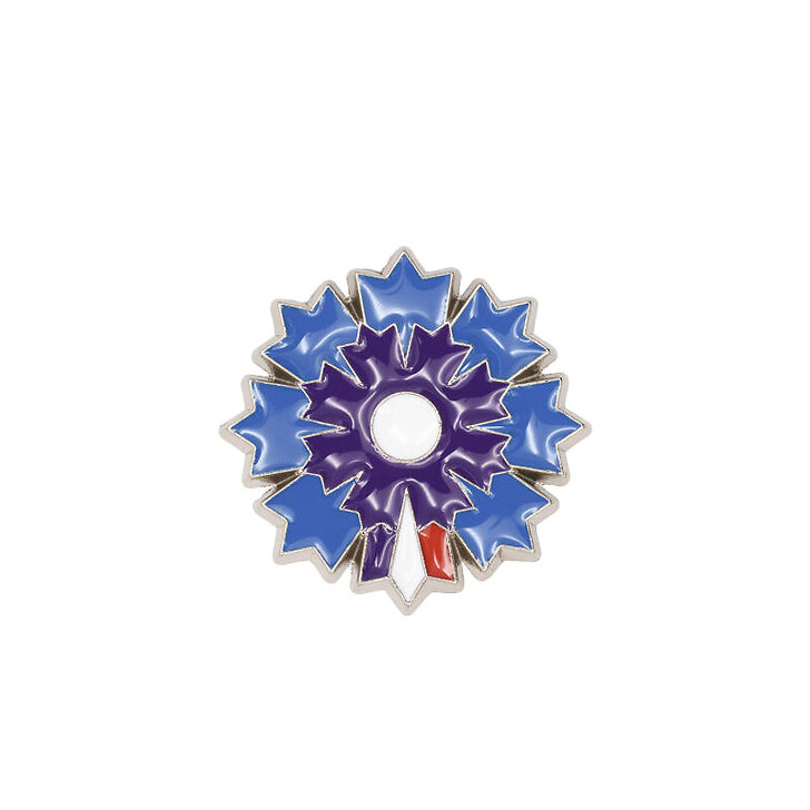 Arborez fièrement ce pin's en métal du Bleuet de France, de couleur argentée et agrémenté d'un pétale bleu-blanc-rouge.