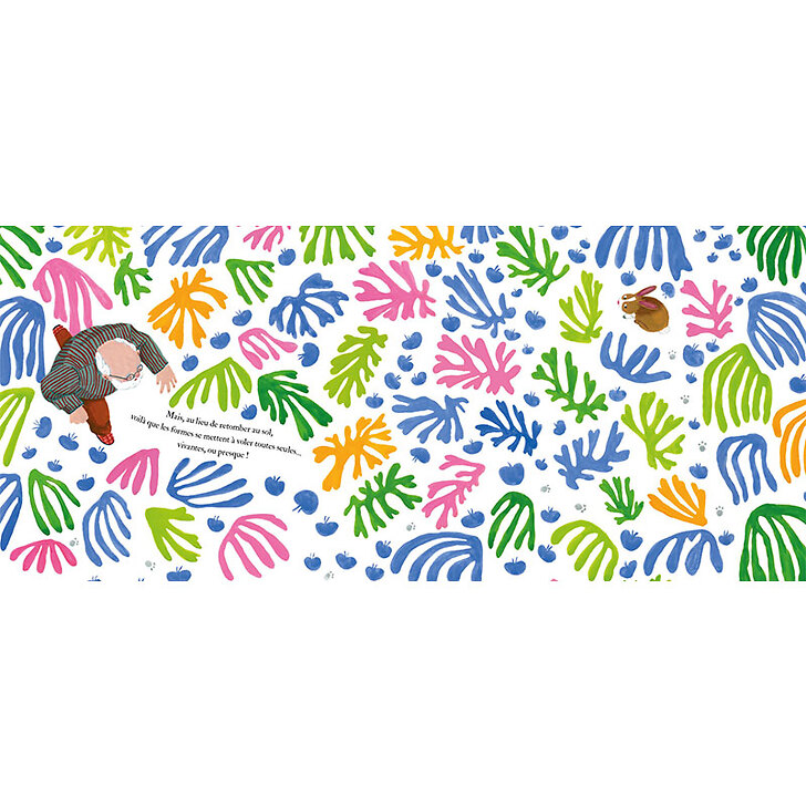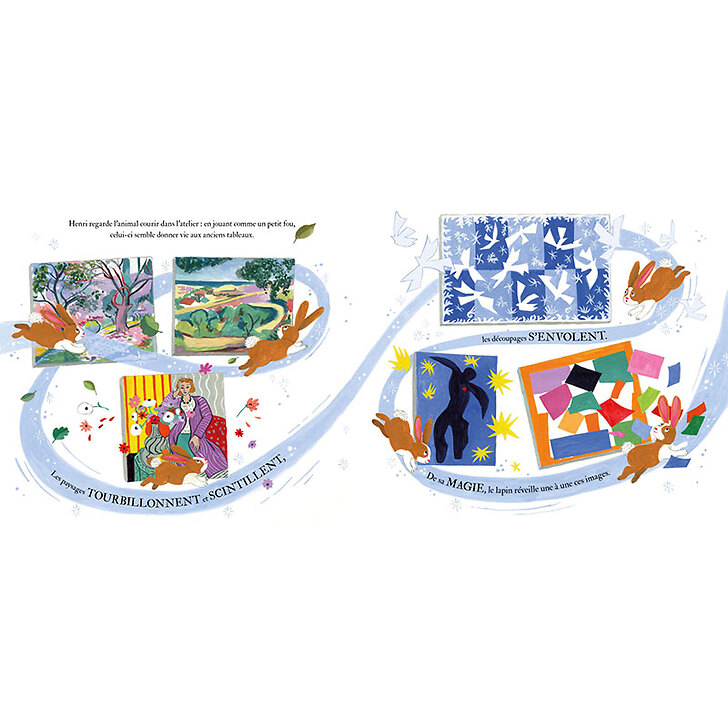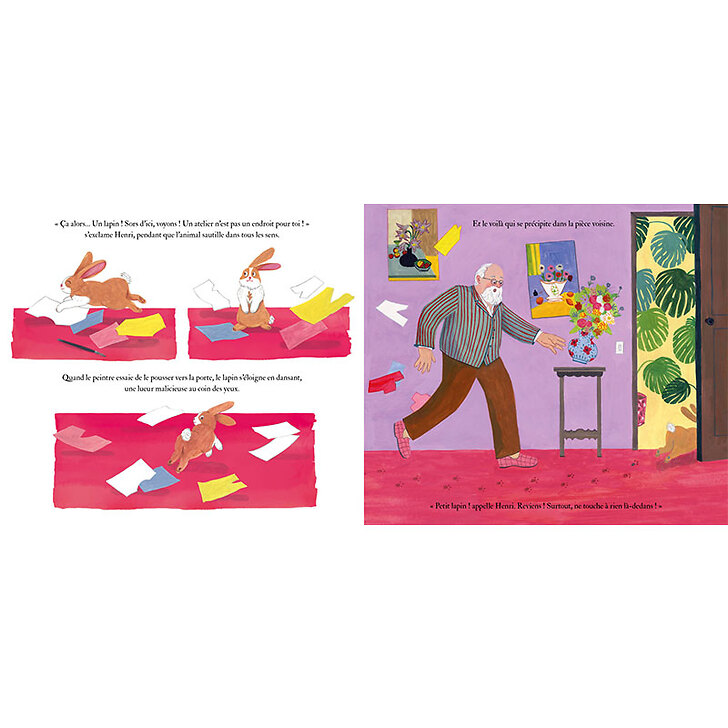Aujourd'hui, le peintre Henri Matisse manque un peu d'inspiration. Quand surgit soudain dans son atelier... un lapin ! Le coquin bondit et cabriole, renverse pinceaux, peintures et papiers.